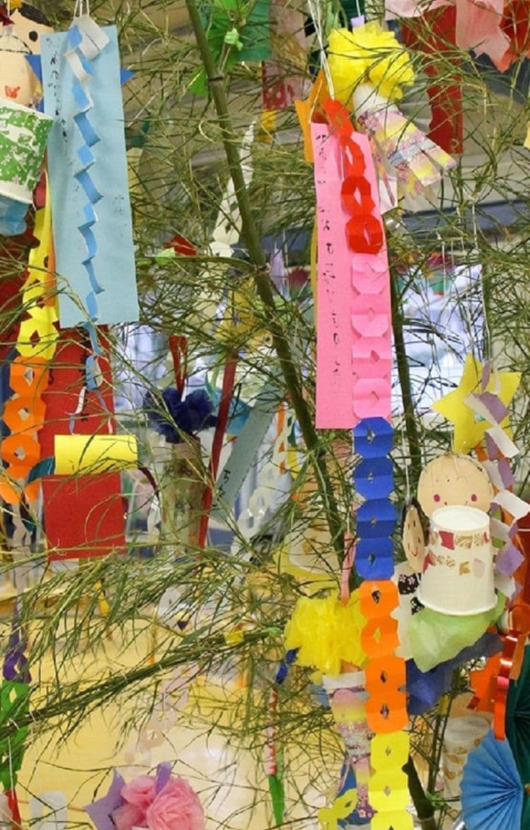 園内で育った笹を切り短冊や飾りを付けてホールで七夕まつりを行います。