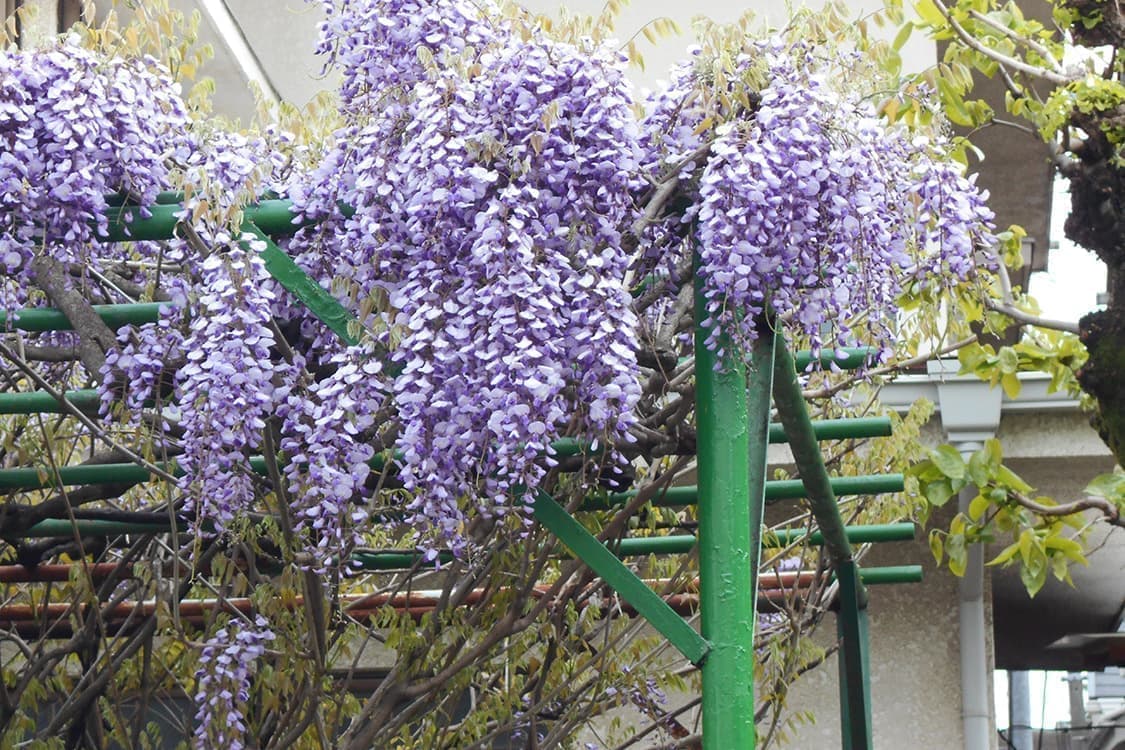 藤の花の咲く園庭に鯉のぼりが泳ぎ、記念写真や鯉のぼりの製作が始まります