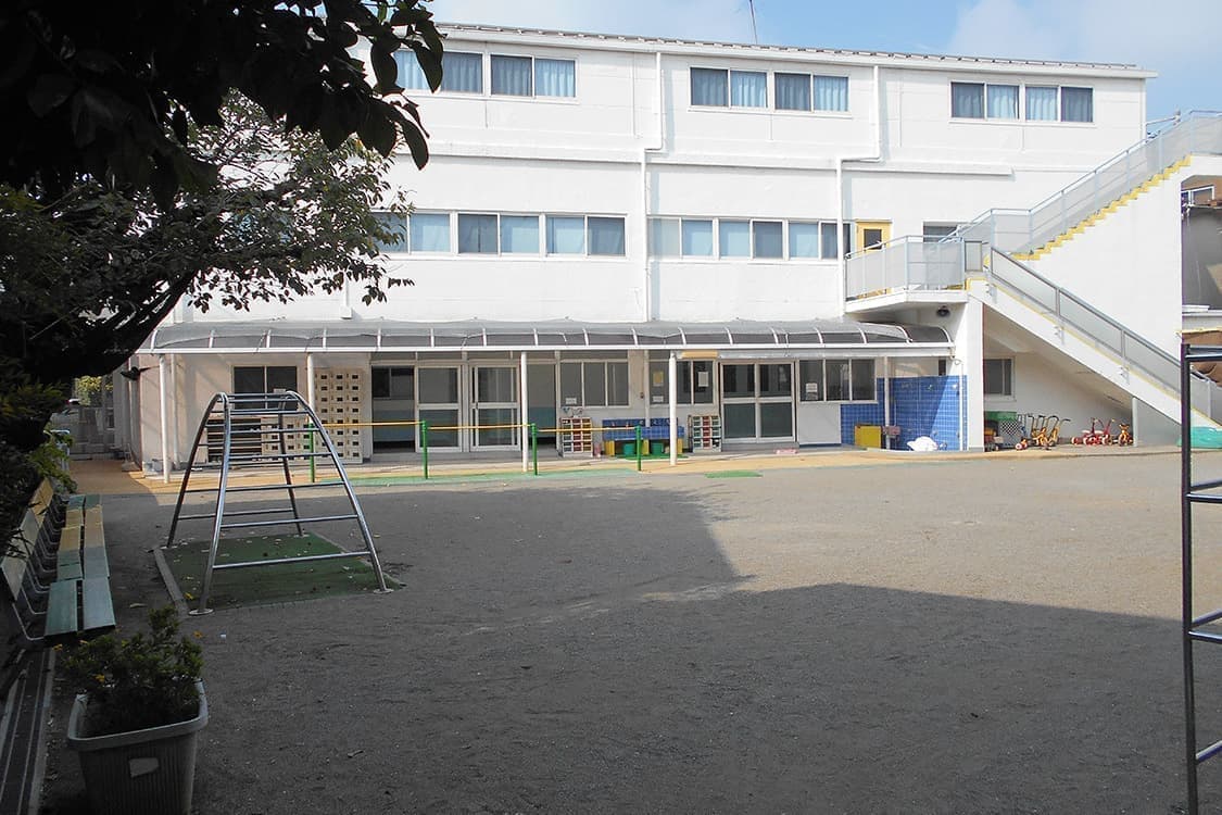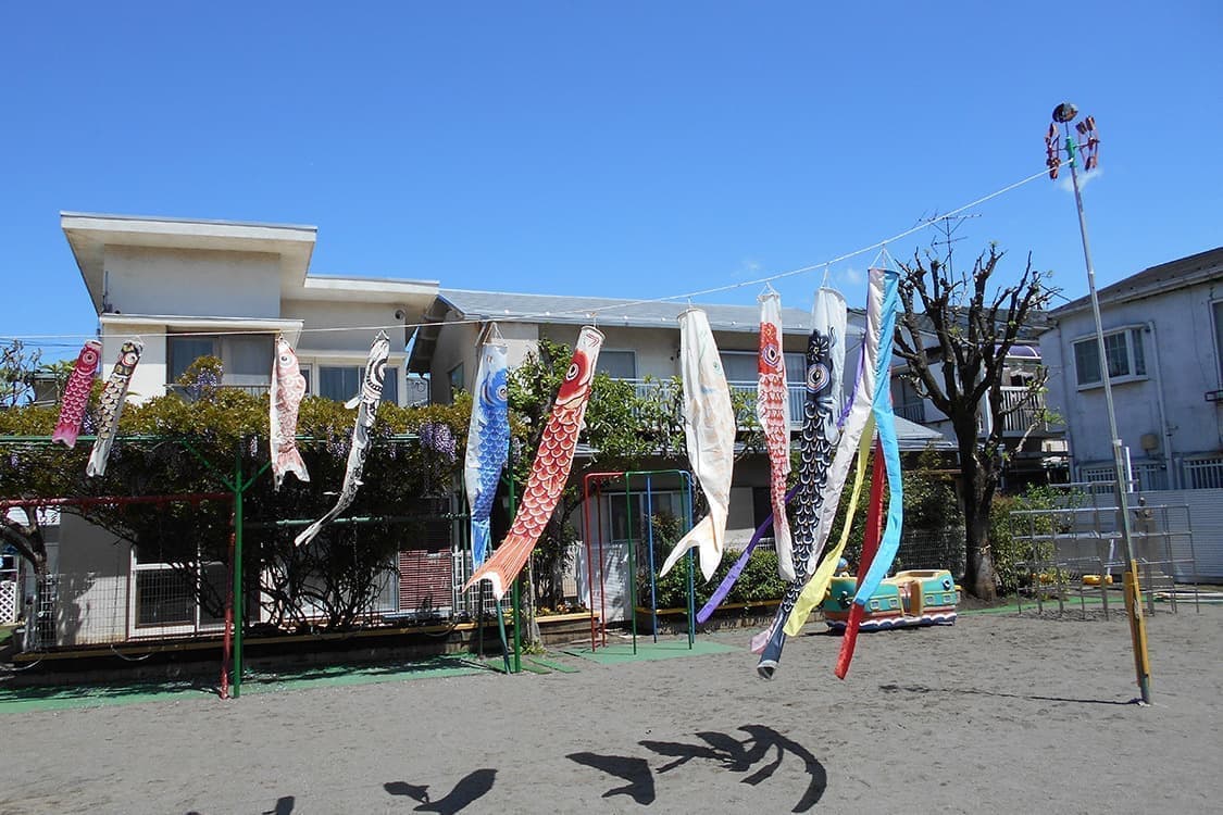 春、桜の花が咲き 藤の花のころには鯉のぼりが園庭にたなびきます。緑が生い茂り始め、大きな木に見守られながら園児が元気よく遊んでいます。ミカンの木にアゲハ蝶の卵を見つけては教室で育て、蛹から蝶になる過程を見守り、園庭で羽ばたかせます。びわの実や柿の実が落ちておままごとの材料にします。